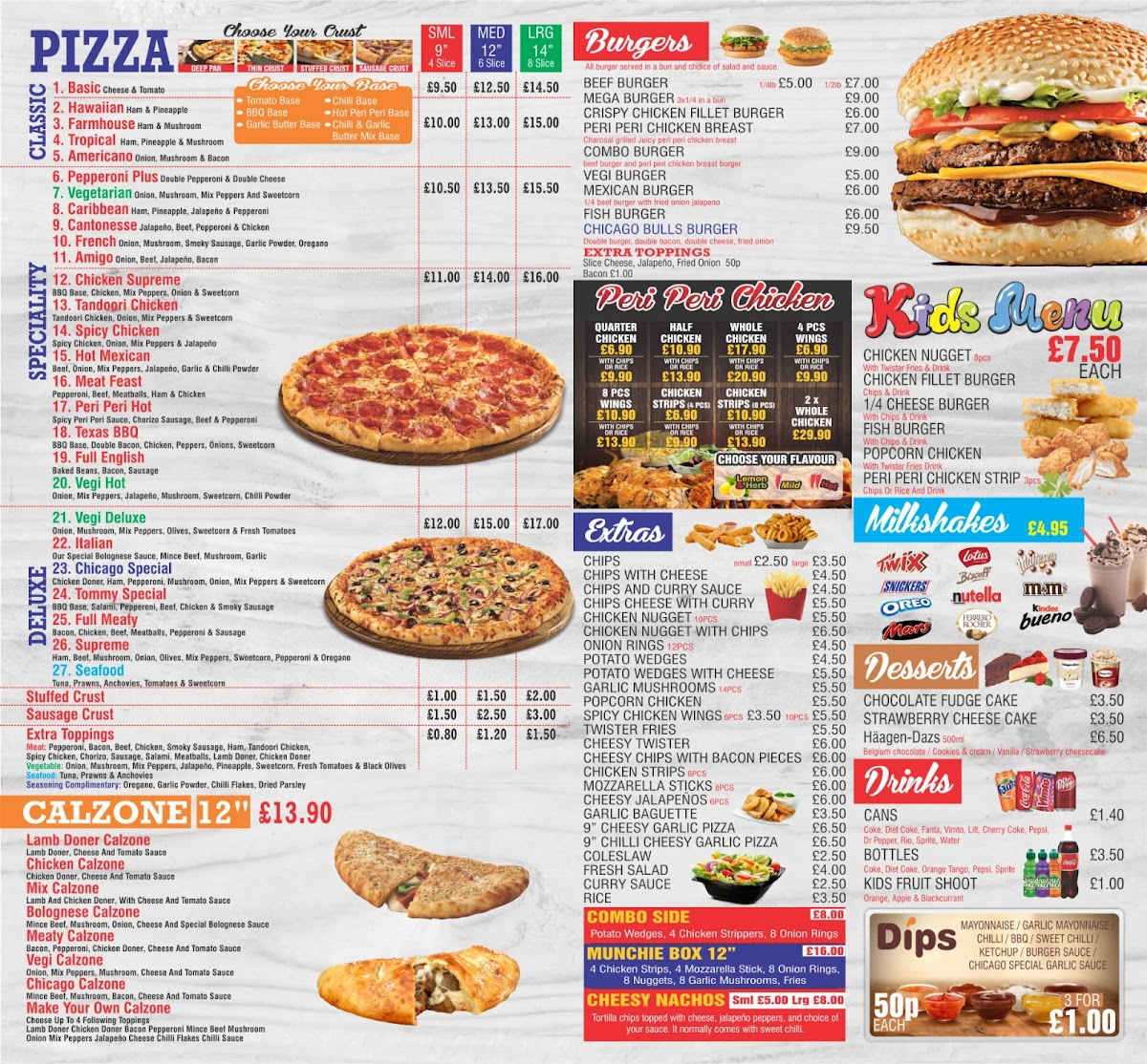 Welcome to Chicago Pizza, located at 58-59 High St, Tewkesbury, where flavor meets affordability! Their diverse menu showcases mouthwatering burgers, including the classic Beef Burger for just £5.00 and the indulgent Chicago Bulls Burger at £9.50. Each bite bursts with freshness, making it a favorite among locals.